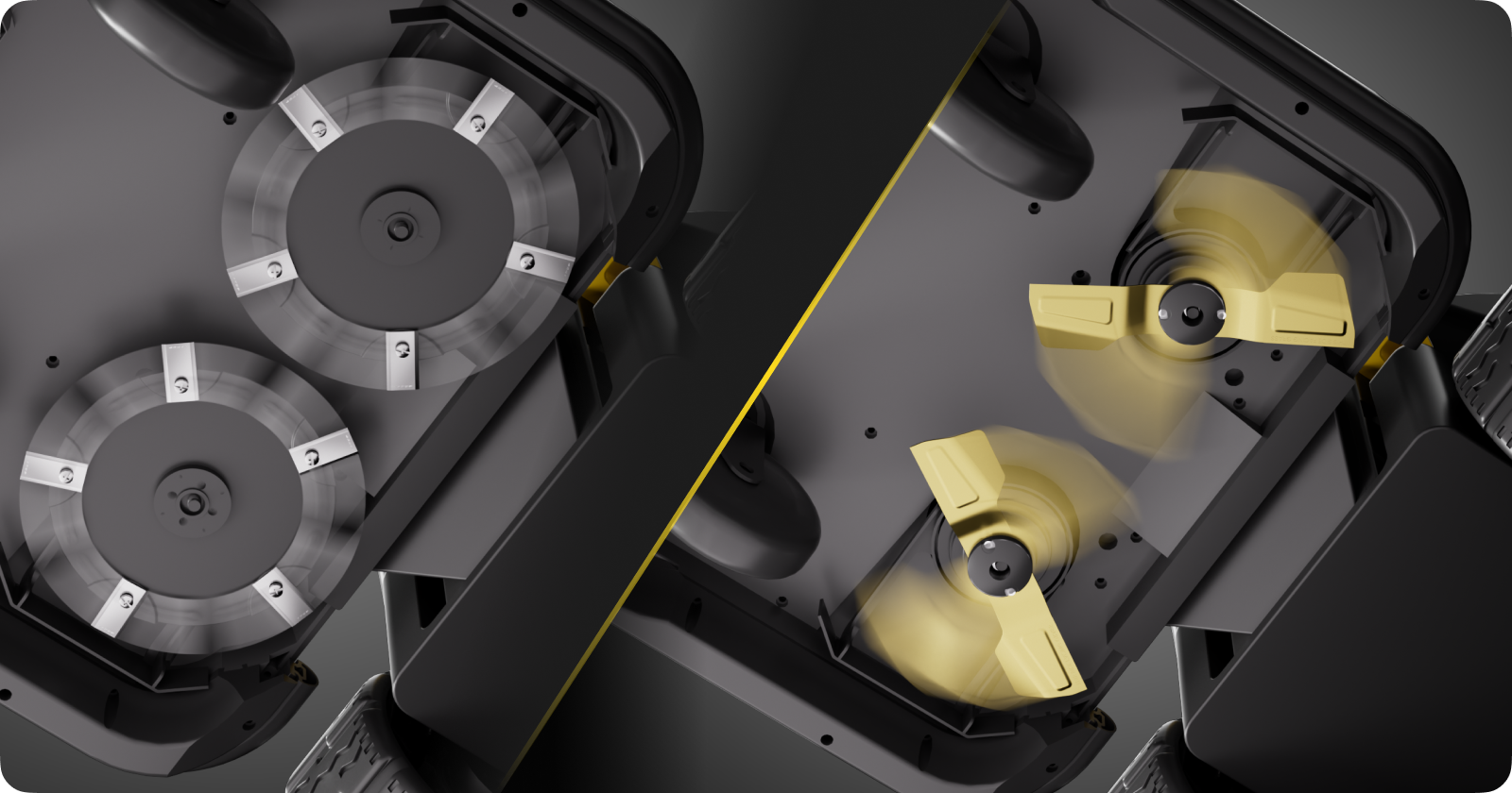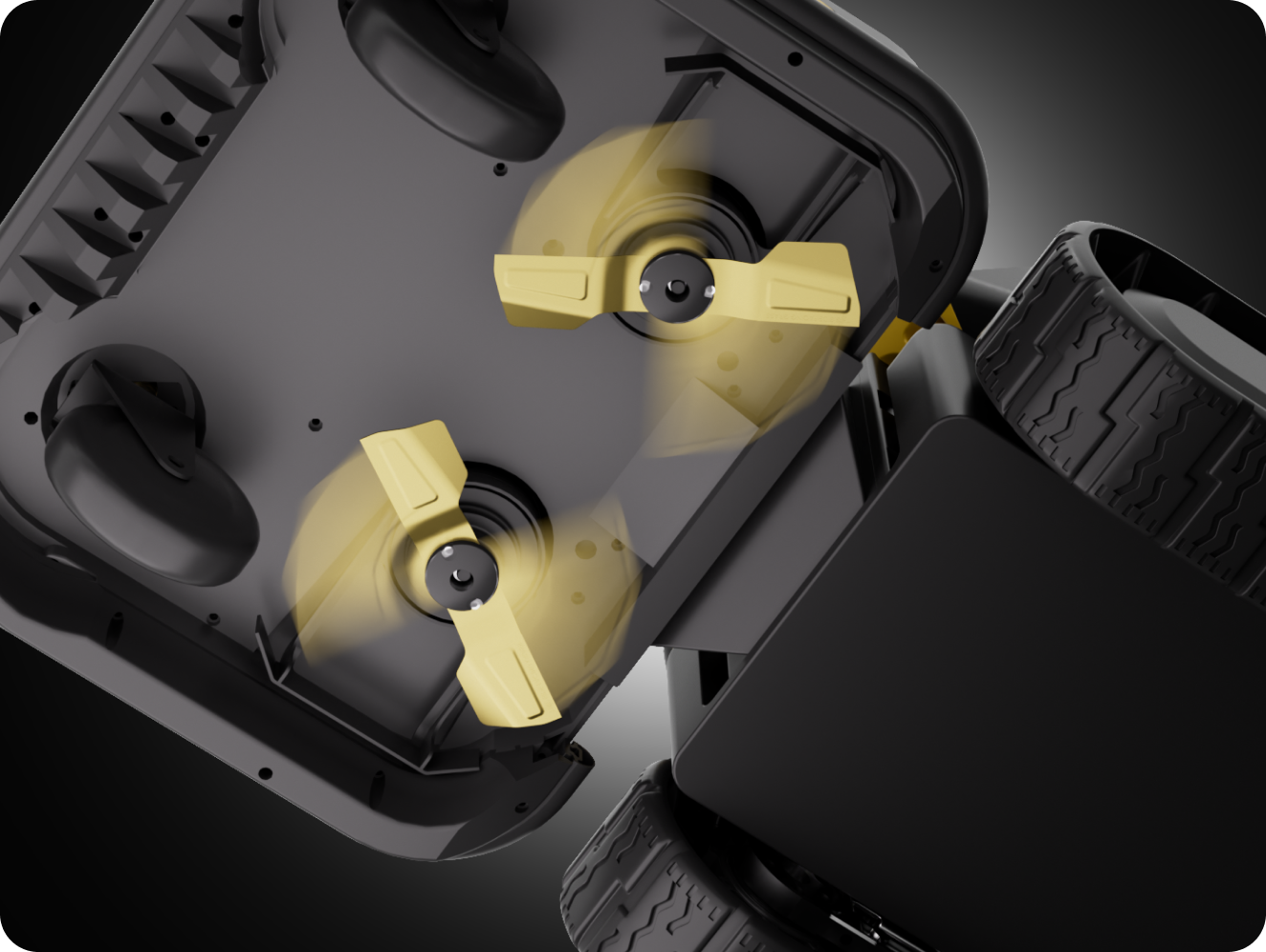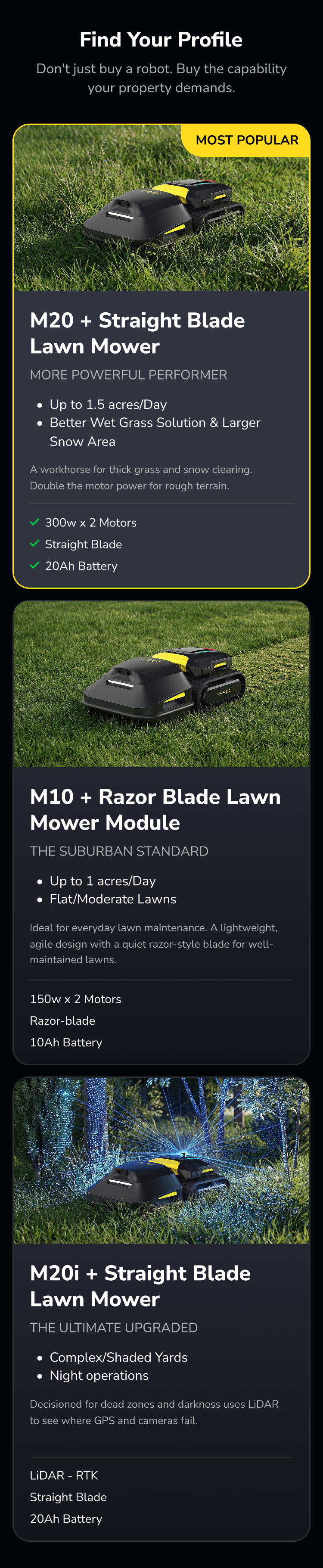 - M20: The Dual 300W high-torque motors drive a rigid, straight blade. It creates a powerful updraft to handle thick, wet, or tall grass that would stall standard robots.