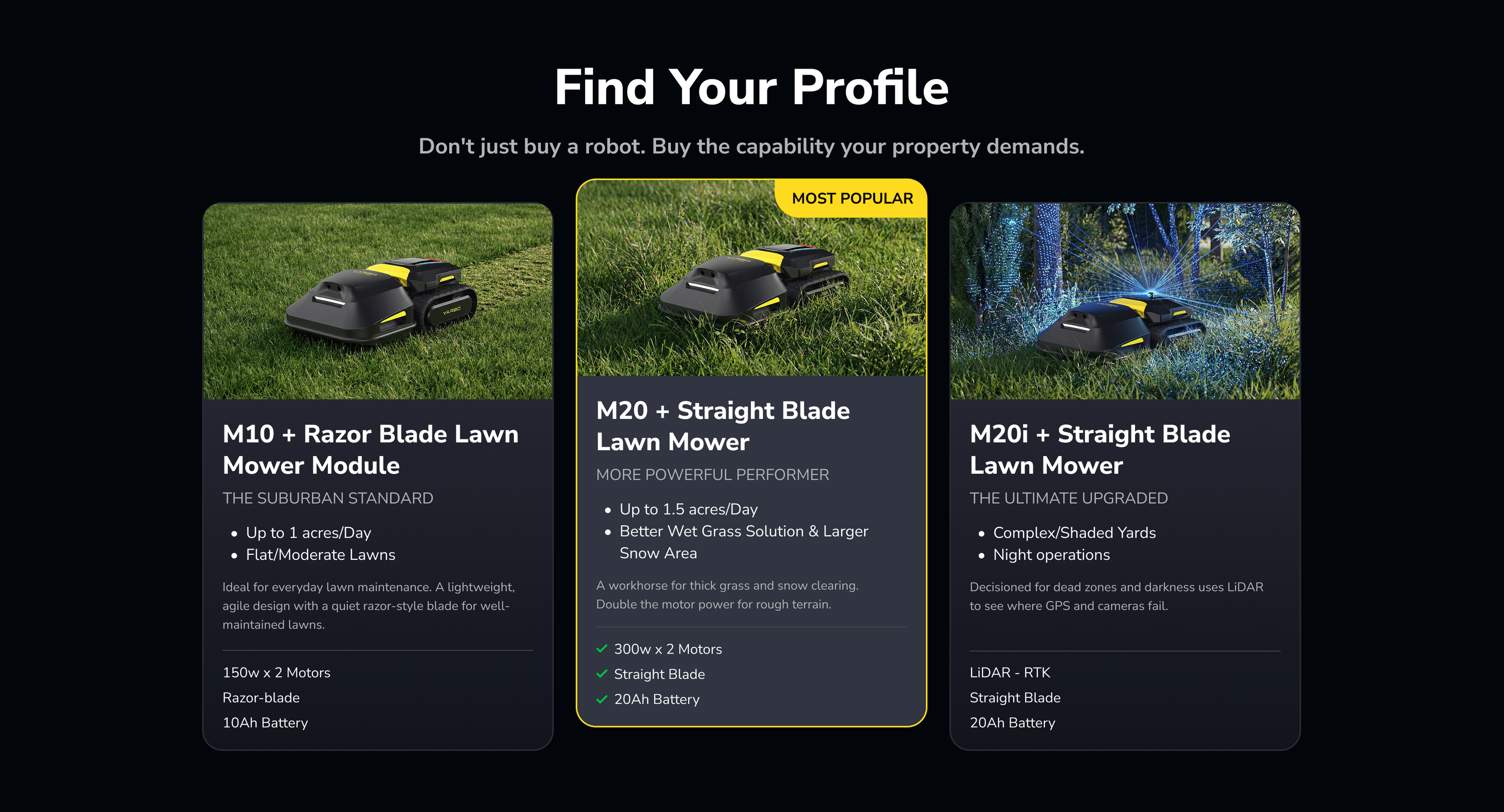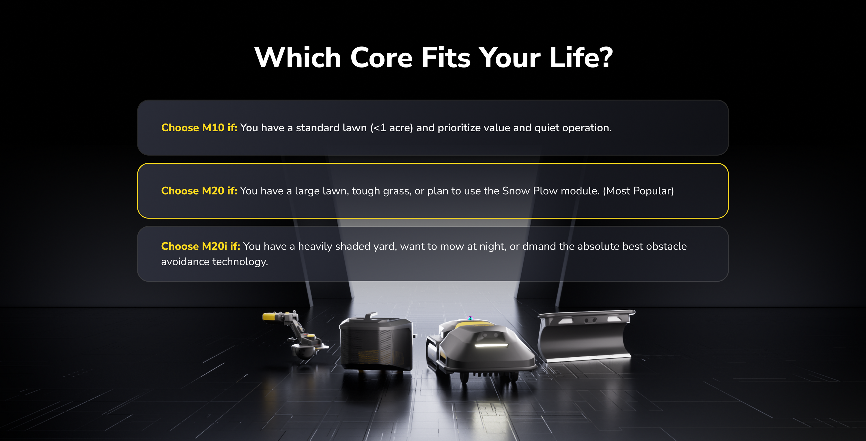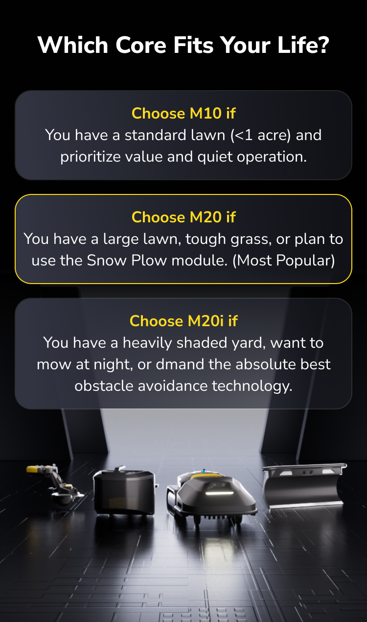 - M20: The Dual 300W high-torque motors drive a rigid, straight blade. It creates a powerful updraft to handle thick, wet, or tall grass that would stall standard robots.