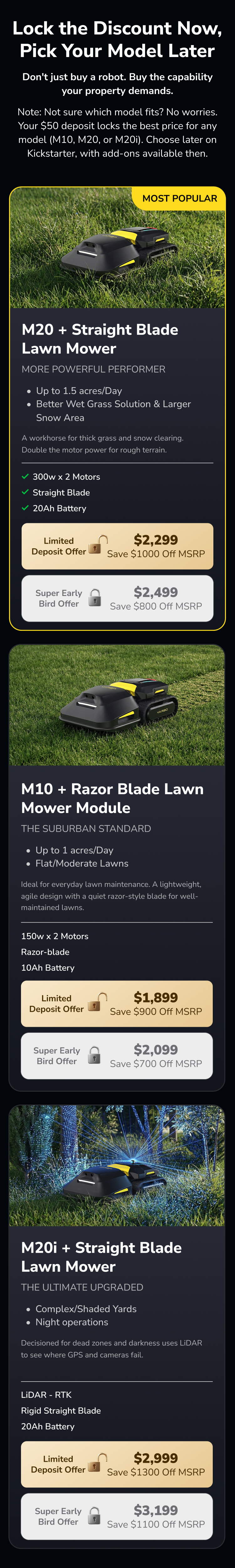 - Lock in the Lowest Price: This exclusive VIP price range covers our three Mower Robot configurations (M10, M20, M20i), which feature different levels of Core Power and Navigation Capabilities. By depositing now, you lock in the best possible price for these mower units during the crowdfunding campaign.