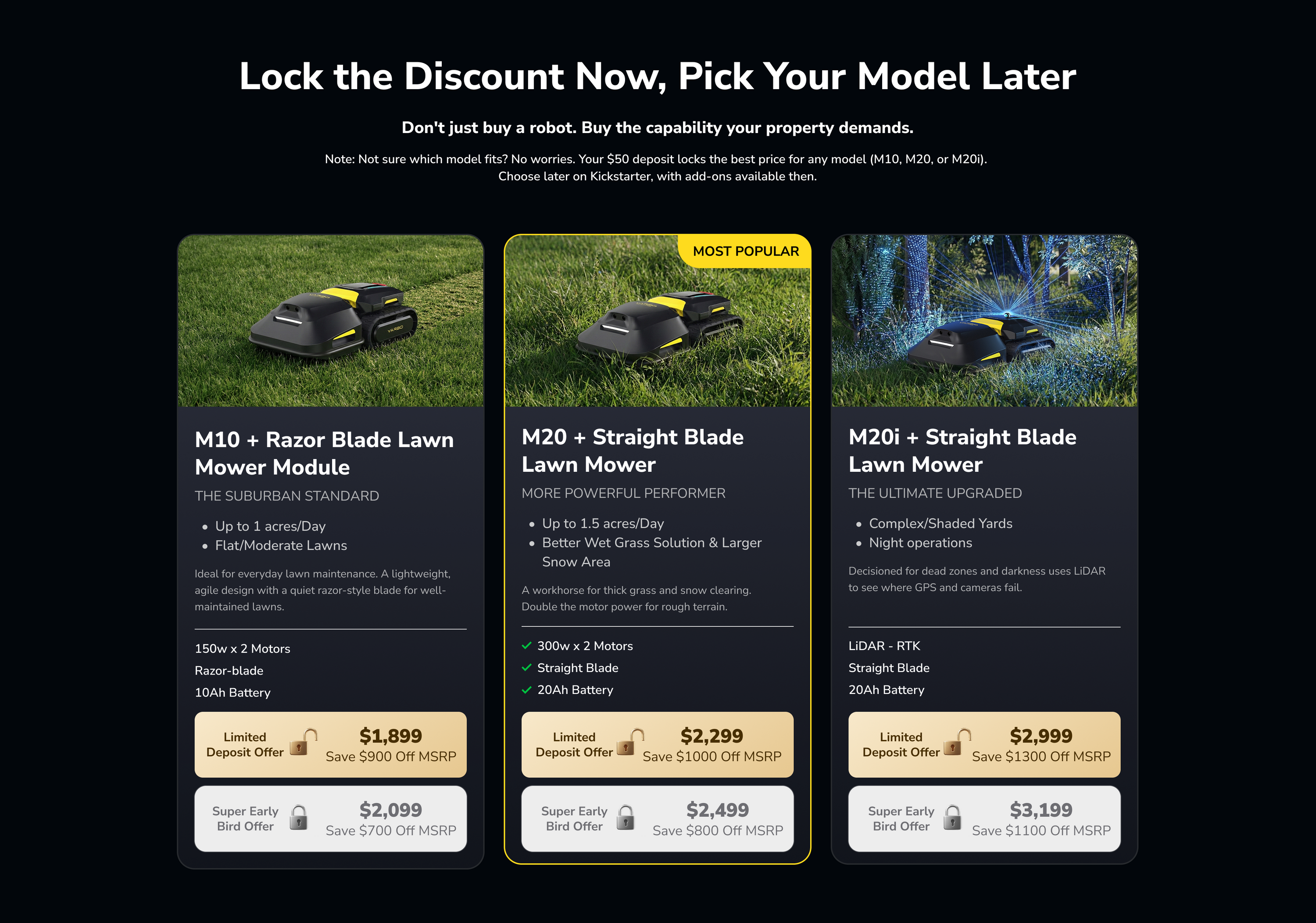 Why do I need to place a deposit before the Kickstarter campaign starts? Placing a deposit is the only way to activate our VIP Price Lock Guarantee, ensuring you secure the absolute lowest price for your Yarbo M Series Mower Robot.